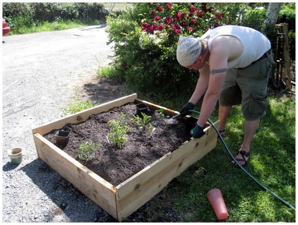 David also built me a small raised bed for our vegetable garden. Here he is last year watering our newly planted tomatoes (that performed poorly due to the abnormally cool 2009 summer):