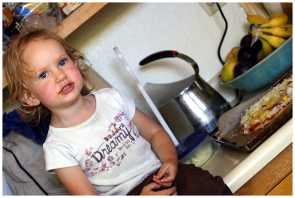 And for the kiddos adverse to wilted leafy green vegetables, you can serve them pasta with chickpeas (and a strip of nori on the side). “Yum, yum, delicious!” says Miss Leyba. Can’t argue with that!